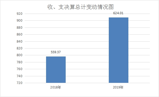 2019年度收、支总计624.01万元。与2018年相比,收、支总计各增加64.64万元,增长11.56%。主要变动原因是脱贫攻坚项目经费投入的增加。